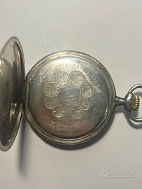 Orologio da tasca vintage Zenith, modello “Grand Prix Paris 1900”, originale. Cassa in argento con incisioni interne e medaglie commemorative, quadrante bianco con numeri arabi neri e scala 13‑24 blu, secondiera a ore 6. Movimento meccanico a carica manuale Zenith, completo. Segni del tempo presenti su cassa e quadrante ma fascino autentico da collezione; perfetto per appassionati di orologi storici o come pezzo da collezione. Da revisionare