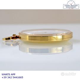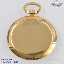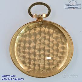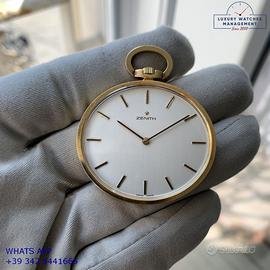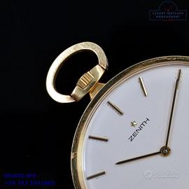 Orologio Zenith da tasca di forma ovale in oro giallo 18KT, anno di produzione 1960 circa, vetro plastica piatto, quadrante colore argento con indici e sfere a bastone dorate, movimento meccanico a carica manuale.