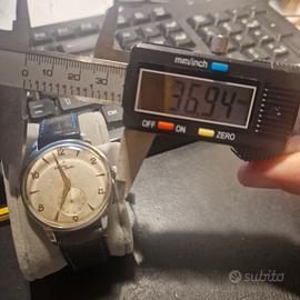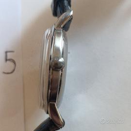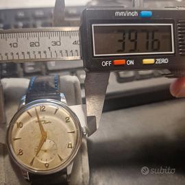 Orologio produzione Zenith degli anni '50. Il logo Zenith con la stella a cinque punte e la dicitura 'Sporto' in corsivo mostrano una tipografia corretta per l'epoca. La patina e l'ossidazione visibili sono naturali e coerenti con un quadrante originale non ristampato. La cassa in acciaio presenta una geometria corretta con anse affusolate. Il fondello mostra il numero di serie '9466968' inciso con un font e una profondità tipici della manifattura Zenith del periodo. Le sfere a gladio con inserti in materiale luminescente (ormai virato) e il sotto-quadrante dei secondi a ore 6 con finitura azurée sono elementi distintivi del modello. Probabilmente monta un calibro manuale 126 o 40, che solitamente in questi modelli è protetto da una calotta interna antipolvere in materiale plastico o metallico. La presenza del numero di serie leggibile sul fondello e l'originalità del quadrante sono fattori positivi. La linea 'Sporto' fu introdotta da Zenith alla fine degli anni '40 come gamma di orologi robusti e affidabili per l'uso quotidiano. Il nome stesso suggeriva una resistenza superiore, spesso garantita da una costruzione della cassa più solida e dall'uso di una protezione interna per il movimento contro polvere e umidità. È un classico esempio dell'eccellenza Zenith nella produzione di orologi solo tempo di alta qualità accessibili a un pubblico più vasto.