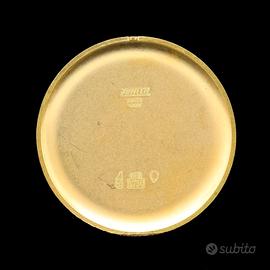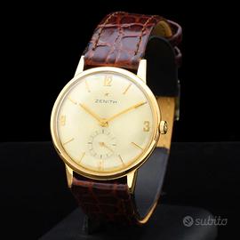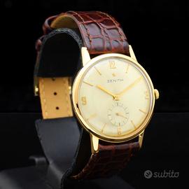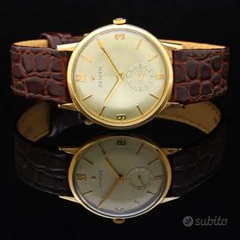 anni 60 in oro rosa 18kt 750 cassa di 34 mm escluso corona vetro plexy quadrante argento corona originale Zenith cinturino Morellato marrone nuovo in pelle fibbia Morellato laminata oro movimento meccanico a carica manuale calibro Z2531 originale Zenith (non trattiamo falsi) perfettamente funzionante revisionato in ottime condizioni rilasciamo fattura di vendita nella quale certifichiamo l'oggetto spediamo gratis in tutto il mondo