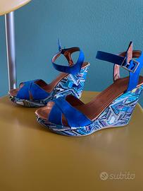Sandalo con comoda zeppa e cinturino alla caviglia. Zeppa originale con disegno geometrico tone sur tone