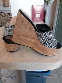 Zeppe alte con fascia bianco nera in materiale rafia, zeppa ricoperta in sughero. n.38. Portate una sola volta.