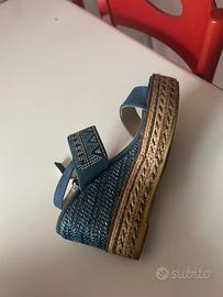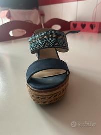 Zeppe con cinturino e perline , fondo sughero e battuta di jeans