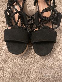 Sandali neri alla schiava con zeppa alta (più di 10 cm) a punta aperta con plateau e lacci in corda di Tata Italia. Numero 38.