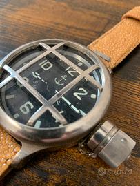 Orologio russo, ispirato ai segnatempo da palombaro. Importante cassa monoblocco da circa 57 mm (esclusa corona). Quest’ultima è a pressione e protetta da un coperchio a vite. È presente anche la griglia, a salvaguardia del vetro. Movimento meccanico a carica manuale, perfettamente funzionante. Cinturino artigianale di alta qualità. No box, no garanzia. Le foto sono parte integrante della descrizione. Prezzo non trattabile.