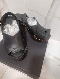 Bellissimi zoccoli con fasce incrociate e cinturino in morbida pelle nera. Plantare in pelle morbido e confortevole, zoccolo in legno scuro con tacco 11,5cm e plateau 4cm, la suola è in gomma antiscivolo. Qualità made in Italy!