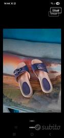 Zoccoli Baldo legno e pelle con apposita molla e soletta imbottita. Taglia 39. La molla serve per ammortizzare gli urti e scaricare il peso del corpo per non affaticare il piede.