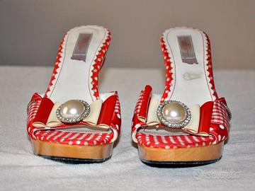 Zoccoli da donna BB N.37 1/2, tessuto e legno, colore rosso e bianco, tacco 10 cm e 2 cm in punta. Usate poco, come nuovi.