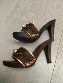 zoccoli con tacco in legno e fascia in tessuto mordore' . Marca m. volponi
