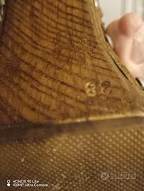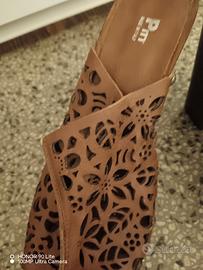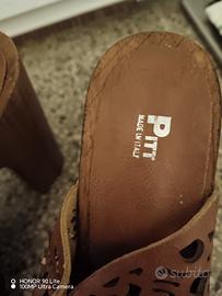 Zoccoli da donna con tacco alto e plateau in legno. Presentano una tomaia in cuoio traforato con motivi floreali e borchie decorative.