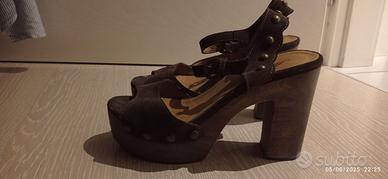Zoccoli legno e pelle marrone n.38, con borchiette colore oro. Tacco 10cm plateau 3,5cm, marca Anna F.