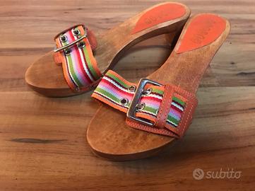 Ciabattine nuove in legno con fascia in tessuto colorata sui toni dell' arancio nr 37