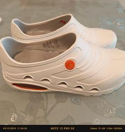zoccoli Oxypas professionali medico/infermiere/ospedale , bianco n. 39/40. usate 1 volta poi basta x cambio professione. Come da foto, nessuna sorpresa. Ottimo stato pari al nuovo, comodissime, arieggiate.
