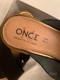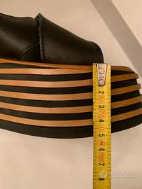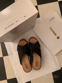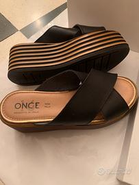 N 39 Zoccoli neri vera pelle capra crust con plateau nero e legno 5/7 cm usati una sola volta in scatola originale suola interna in pelle perfetta suola esterna in gomma perfetta. Si forniscono maggiori fotografie.