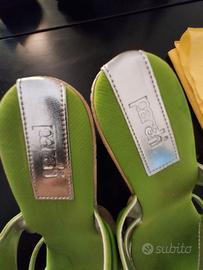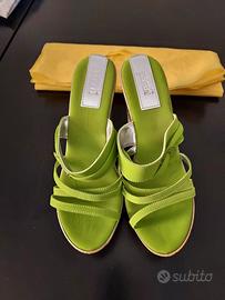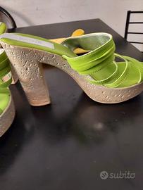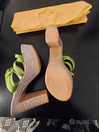zoccoli nuovi verde con tacco 12 totale compreso la doppia suola. intreccio laccetti particolari . n.40