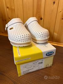 Zoccoli sanitari School, modello clog supercomfort, con plantare anatomico in legno di faggio e cinturino.