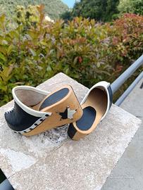 Incredibile unicità per questo paio di zoccoli in legno con pelle bianco e nera realizzata interamente a mano per rendere il tuo stile inimitabile ed essere al centro dell attenzione.