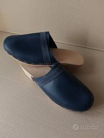Zoccoli chiusi di colore blu, NUOVI, in legno e pelle fatti interamente a mano, n. 42