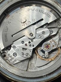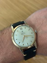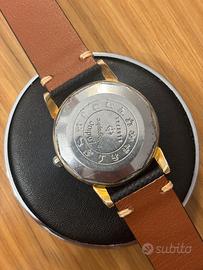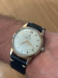 Affascinante Zodiac Rotographic automatico vintage, prodotto da Zodiac Ltd, Le Locle, Svizzera, presumibilmente tra la fine degli anni ’50 e i primi anni ’60. • Quadrante: Argenté originale con indici applicati misti (bastoncini e triangoli dorati) e lancette dorate affusolate. Il quadrante presenta una patina vintage uniforme e caratteristica dell’epoca. Unico indice numerico al 12. Firma Zodiac con logo a croce e dicitura “Rotographic” in corsivo. Scritta SWISS sul quadrante. • Cassa: 36mm (esclusa corona), gold filled, con fondello in acciaio inossidabile. Riferimento cassa 689. La cassa presenta segni d’uso coerenti con l’età, con qualche micro-graffio sulla superficie dorata. • Corona e cassa logata Zodiac. • Profilo: Molto sottile ed elegante, con lunette affusolate caratteristiche dello stile degli anni ’50-’60. • Fondello: Decorato con il caratteristico motivo a rilievo dei segni zodiacali e scritta “Zodiac Rotographic” con il logo. Numerazione seriale visibile. • Movimento: Automatico, AS 1361N, 17 rubini (Seventeen 17 Jewels), regolato svizzero (Adjusted Swiss). Movimento funzionante e in buone condizioni visive. • Cinturino: Nuovo aftermarket in pelle nera. 🕰️ La Storia di Zodiac Zodiac è uno dei marchi orologieri svizzeri più antichi e affascinanti, fondato nel 1882 a Le Locle, nel cuore della Valle dell’orologeria svizzera. Il nome “Zodiac” venne adottato ufficialmente nel 1908, e il celebre logo con la croce inscritta nel cerchio divenne presto uno dei simboli più riconoscibili del settore. Negli anni ‘50 e ‘60 Zodiac raggiunse l’apice della sua notorietà internazionale, distinguendosi per innovazioni tecniche di rilievo: fu tra i pionieri dell’orologio automatico a rotor, da cui derivò la linea “Rotographic” – nome che celebrava proprio la tecnologia del rotore automatico integrata nel design.