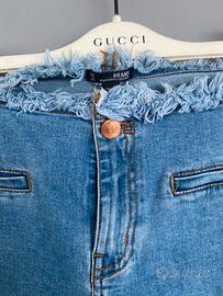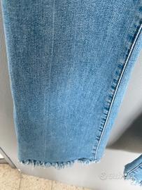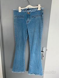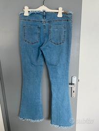 Jeans a zampa in denim blu chiaro del marchio ZUIK, con dettagli sfrangiati in vita e sul fondo delle gambe. Il capo presenta due tasche posteriori e due finte tasche anteriori. Bottoni in metallo con logo. Condizioni molto buone, senza segni evidenti di usura. Vestibilità a vita alta, materiale in cotone denim leggermente elasticizzato. Ideale per look casual anni '70. Taglia 46 #zuiki #jeans #jeanszampa #flare #frange #fringes