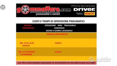 NOTA2: Tutti i nostri pneumatici sono testati e controllati , con personale specializzato e appositi macchinari al fine di garantire la massima sicurezza ed affidabilit, TUTTAVIA, ALCUNI pneumatici USATI potrebbero presentare difetti estetici ( es. particelle mancanti sul bordo salva cerchio, screpolature, semplici riparazioni da NORMALE FORATURA etc.) che NON INFLUISCONO assolutamente sulla sicurezza degli stessi. Per quanto citato, preghiamo il cliente estremamente esigente di rivolgersi esclusivamente all'acquisto di pneumatici NUOVI , DEMO o KM0. Termini e Condizioni Visionabili sul sito cliccando sulla voce "Sito web" visibile nel lato destro di questa pagina.