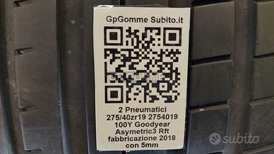 2 Pneumatici 275/40r19 2754019 Goodyear Eagle As3 Rft anno fabbricazione 2018 con 5mm spedizioni in tutta italia incluse, montaggio €40 presso la notra officina
