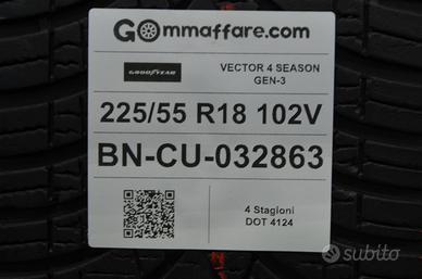 > Marca: goodyear > Misura: 225/55 r18 225/55/18 2255518 > Modello: vector 4 season gen-3 > Condizioni: accettabile > Stagione: 4 stagioni > Carico e Velocità: 102v > Battistrada Residuo: 68% > Dot: 4124 > Sede: Strada Statale Appia n°16 , Bonea (Provincia di Benevento) > Fisso: 0823-1500000 > Cellulare whatsapp: 327-4215765 > Cellulare whatsapp: 379-1416142 NOTA1: La misurazione della profondità del battistrada residuo che viene effettuata e riportata in descrizione è INDICATIVA e soprattutto POTREBBE essere approssimativa.(può variare dal punto della misurazione o può variare leggermente da uno pneumatico all'altro) Stesso discorso per il DOT (data di fabbricazione) dello pneumatico. Potrebbe esserci una piccola variazione tra uno pneumatico e l'altro. (Ad es. uno pneumatico 0520 e l'altro 4019). Sono TUTTI DATI INDICATIVI. Quando la differenza sostanziale e/o SIGNIFICATIVA verrà riportato nella descrizione principale dell'annuncio! Ricordiamo sempre che si tratta di pneumatici USATI e che i clienti ESTREMAMENTE Esigenti DEVONO ORIENTARSI all'acquisto di pneumatici della categoria Nuovo o Demo. NON VERRANNO ACCETTATI RECLAMI su MINIME differenza su citate. NOTA2: TUTTI i nostri pneumatici USATI sono testati e controllati , con personale specializzato e appositi macchinari al fine di garantire la massima sicurezza ed affidabilità, TUTTAVIA, ALCUNI pneumatici USATI potrebbero presentare difetti estetici ( es. particelle mancanti sul bordo salva cerchio, screpolature, semplici riparazioni da NORMALE FORATURA etc.) che NON INFLUISCONO assolutamente sulla sicurezza degli stessi. Per quanto citato, Ricordiamo sempre che si tratta di pneumatici USATI e che i clienti ESTREMAMENTE Esigenti DEVONO ORIENTARSI all'acquisto di pneumatici della categoria Nuovo o Demo. NON VERRANNO ACCETTATI RECLAMI per difetti estetici su citati.