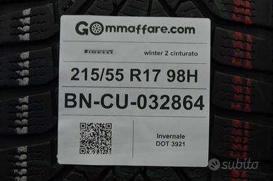 > Marca: pirelli > Misura: 215/55 r17 215/55/17 2155517 > Modello: winter 2 cinturato > Condizioni: accettabile > Stagione: invernali > Carico e Velocità: 98h > Battistrada Residuo: 68% > Dot: 3921 > Sede: Strada Statale Appia n°16 , Bonea (Provincia di Benevento) > Fisso: 0823-1500000 > Cellulare whatsapp: 327-4215765 > Cellulare whatsapp: 379-1416142 NOTA1: La misurazione della profondità del battistrada residuo che viene effettuata e riportata in descrizione è INDICATIVA e soprattutto POTREBBE essere approssimativa.(può variare dal punto della misurazione o può variare leggermente da uno pneumatico all'altro) Stesso discorso per il DOT (data di fabbricazione) dello pneumatico. Potrebbe esserci una piccola variazione tra uno pneumatico e l'altro. (Ad es. uno pneumatico 0520 e l'altro 4019). Sono TUTTI DATI INDICATIVI. Quando la differenza sostanziale e/o SIGNIFICATIVA verrà riportato nella descrizione principale dell'annuncio! Ricordiamo sempre che si tratta di pneumatici USATI e che i clienti ESTREMAMENTE Esigenti DEVONO ORIENTARSI all'acquisto di pneumatici della categoria Nuovo o Demo. NON VERRANNO ACCETTATI RECLAMI su MINIME differenza su citate. NOTA2: TUTTI i nostri pneumatici USATI sono testati e controllati , con personale specializzato e appositi macchinari al fine di garantire la massima sicurezza ed affidabilità, TUTTAVIA, ALCUNI pneumatici USATI potrebbero presentare difetti estetici ( es. particelle mancanti sul bordo salva cerchio, screpolature, semplici riparazioni da NORMALE FORATURA etc.) che NON INFLUISCONO assolutamente sulla sicurezza degli stessi. Per quanto citato, Ricordiamo sempre che si tratta di pneumatici USATI e che i clienti ESTREMAMENTE Esigenti DEVONO ORIENTARSI all'acquisto di pneumatici della categoria Nuovo o Demo. NON VERRANNO ACCETTATI RECLAMI per difetti estetici su citati.