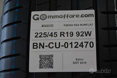 Marca: pirelli Misura: 225/45 r19 225/45/19 2254519 Modello: pzero pz4 runflat Condizioni: seminuovi (max 5mila km) Tipologia: estivi Carico e velocità: 92w Battistrada residuo: 93.33% Dot: 2019 Sede: Strada Statale Appia n°16 , Bonea (Provincia di Benevento) Fisso: 0823-1500000 Cell,whatsapp: 327-4215765 - 379-1416142