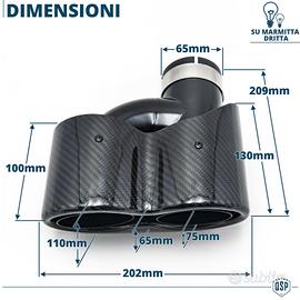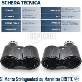2 Terminali di Scarico Doppi H Tondi per AutoUniversali in CARBONIO VERO e ACCIAIO NERO Inossidabile SS304 | Taglio Obliquo| Avvitamento con Bullone su MARMITTE Ø da 55 a 65mm (Max.) - LOOK SPORTIVO RIVOLUZIONATO | Trasformazione da Scarico Singolo a DoppioScarico in Carbonio, Largo 202mm, Alto 104mm, Taglio Obliquo. - INSTALLAZIONE FACILE | Plug & Play, si Blocca Stringendo 1 Bullone, suMarmitte a Sinistra con Diametro Massimo 65mm. - RESISTE AL TEMPO | VERA Fibra di Carbonio e Acciaio Inox SS304 Resistono aRuggine, Scolorimento, Intemperie, Urti. - USO LEGALE | Non è Necessaria Alcuna Omologazione, Il Terminale Scarico è UnaDecorazione che Non Varia gli Ingombri dell'Auto. MATERIALI: Prodotto in ACCIAIO INOX SS304 e VERA FIBRA DI CARBONIO, di qualità eccellentenella scelta dei materiali, Rifiniture del Dettaglio, tatto, e Colorazione COMPATIBILITÀ: - Tutti i Veicoli con Marmitta Dritta - Diametro marmitta Compreso tra Ø 55mm e Ø 65mm Massimo. MONTAGGIO: 1) Misurare l'Apertura del Paraurti per Assicurare la Fuoriuscita del NuovoTerminale 2) Far Scorrere Il Nuovo Terminale sullo Scarico Esistente 3) Avvitare le Viti di Serraggio DETTAGLI TECNICI: - Materiale: Acciaio INOSSIDABILE - Sezione: Doppio Tondo - Taglio Obliquo: Si, a Fetta di Salame - Colore: Carbonio e Nero - Finitura: Carbon - Peso: 0,815Kg (singolo) - Dimensioni: LUN da 209-176 mm - LAR 202 mm - H 104 mm - Metallo Composto: 18% Cromo, 8% Nichel - Magnetismo: No - Basso - Confezionamento: Box Cartone Originale - Resistenza alle Intemperie: ELEVATA - Bloccaggio: a Bulloni - Lavorabilità: Eccellente (si Presta alla Saldatura) PER INFO CONTATTARE AL 3927091031 ANCHE LINEA WhatsApp OPPURE VIA E-MAIL: rtautoitalia2018@libero.it CONSEGNA: - Effettuiamo Spedizioni 24-48H in TUTTA ITALIA - Ritiro in Sede con Possibilità di Visionare il Prodotto - Vendiamo solo Articoli Nuovi PAGAMENTI: - PayPal - Con Carta - Bonifico Bancario - Alla Consegna con Con