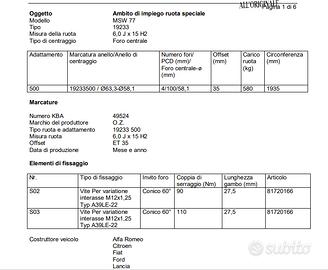 Vendo set completo di 4 cerchi in lega MSW 77 (prodotti da OZ Racing) da 15 pollici, finitura antracite/nero opaco, comprensivi di pneumatici invernali. Il set era montato su Alfa Romeo MiTo 1.6 JTDm, ma è compatibile con moltissime vetture grazie alla foratura 4x100 e ai bulloni speciali inclusi. CARATTERISTICHE TECNICHE CERCHI: Marca/Modello: MSW 77 (prodotto da OZ) Misure: 6J x 15 H2 Offset (ET): 35 Foratura (PCD): 4x100 (perfetti anche per Fiat/Alfa/Lancia 4x98 con i bulloni inclusi) Condizioni: Buone, normali segni di utilizzo (come da foto). PNEUMATICI: Marca/Modello: Hankook Winter i*cept RS2 Misura: 185/65 R15 88T Stato: Battistrada residuo al 50% circa (ancora una stagione/inverno di utilizzo in sicurezza). ACCESSORI INCLUSI (IMPORTANTE): Kit 16 bulloni autocentranti (viti per variazione interasse M12x1,25) specifici per montaggio su mozzi 4x98 (Alfa MiTo, Fiat Punto, Lancia Ypsilon). Anelli di centraggio già inseriti. COMPATIBILITÀ PRINCIPALI: (tutti i modelli 4 fori) PREZZO: € 250 (leggermente trattabili) Note: Ritiro a mano in zona [Inserisci tua città/zona]. Disponibile per visione.