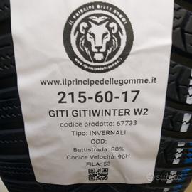 4 GOMME USATE INVERNALI ANNUNCIO 67733 Misura: 215 60 17 96H Marca: GITI Modello: GITIWINTER W2 Stagione: INVERNALI Stato: Usate, in perfette condizioni Battistrada residuo: 80% (come da foto/indicazioni) Perch scegliere i nostri pneumatici? Tutti i nostri pneumatici sono testati al 100% con macchinari prova-gomme di ultima generazione per garantire la massima sicurezza e affidabilità. Servizi e Contatti: Preventivi: Contattateci anche per preventivi su altre misure. Per informazioni o acquisti, Cell / WhatsApp: +39 389 763 5032 Montaggio e Bilanciatura: Possibilità di montaggio e bilanciatura direttamente presso la nostra sede. Ritiro: Ritiro a mano disponibile 7 giorni su 7. Spedizione: Spedizione rapida in tutta Italia al costo di 20,00 a coppia. Pagamenti: Accettiamo PayPal, bonifico e contrassegno. Abbiamo anche una vasta scelta di gomme auto, furgone, 4x4 e fuoristrada: invernali (termiche/da neve), estive e 4 stagioni. 215 60 17 | 215/60/17 | 215/60R17 | 215-60-17 | 215.60.17 | 215 60 R17)
