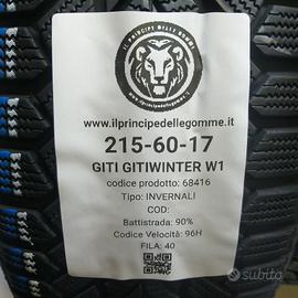 4 GOMME USATE INVERNALI ANNUNCIO 68416 Misura: 215 60 17 96H Marca: GITI Modello: GITIWINTER W1 Stagione: INVERNALI Stato: Usate, in perfette condizioni Battistrada residuo: 90% (come da foto/indicazioni) Perch scegliere i nostri pneumatici? Tutti i nostri pneumatici sono testati al 100% con macchinari prova-gomme di ultima generazione per garantire la massima sicurezza e affidabilità. Servizi e Contatti: Preventivi: Contattateci anche per preventivi su altre misure. Per informazioni o acquisti, Cell / WhatsApp: +39 389 763 5032 Montaggio e Bilanciatura: Possibilità di montaggio e bilanciatura direttamente presso la nostra sede. Ritiro: Ritiro a mano disponibile 7 giorni su 7. Spedizione: Spedizione rapida in tutta Italia al costo di 20,00 a coppia. Pagamenti: Accettiamo PayPal, bonifico e contrassegno. Abbiamo anche una vasta scelta di gomme auto, furgone, 4x4 e fuoristrada: invernali (termiche/da neve), estive e 4 stagioni. 215 60 17 | 215/60/17 | 215/60R17 | 215-60-17 | 215.60.17 | 215 60 R17)