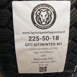 4 GOMME USATE INVERNALI ANNUNCIO 67793 Misura: 225 50 18 99H Marca: GITI Modello: GITIWINTER W1 Stagione: INVERNALI Stato: Usate, in perfette condizioni Battistrada residuo: 90% (come da foto/indicazioni) Perch scegliere i nostri pneumatici? Tutti i nostri pneumatici sono testati al 100% con macchinari prova-gomme di ultima generazione per garantire la massima sicurezza e affidabilità. Servizi e Contatti: Preventivi: Contattateci anche per preventivi su altre misure. Per informazioni o acquisti, Cell / WhatsApp: +39 389 763 5032 Montaggio e Bilanciatura: Possibilità di montaggio e bilanciatura direttamente presso la nostra sede. Ritiro: Ritiro a mano disponibile 7 giorni su 7. Spedizione: Spedizione rapida in tutta Italia al costo di 20,00 a coppia. Pagamenti: Accettiamo PayPal, bonifico e contrassegno. Abbiamo anche una vasta scelta di gomme auto, furgone, 4x4 e fuoristrada: invernali (termiche/da neve), estive e 4 stagioni. 225 50 18 | 225/50/18 | 225/50R18 | 225-50-18 | 225.50.18 | 225 50 R18)
