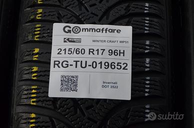 > Marca: kumho > Misura: 215/60 r17 215/60/17 2156017 > Modello: winter craft wp51 > Condizioni: usati >Tipologia: invernali > Carico e velocità: 96h > Battistrada residuo: 83% 68% > Dot: 3522 > Sede: Via del lavoro n°13, Argelato(Provincia di Bologna) > Fisso: 0823-15 00 000 > Cellulare - whatsapp: 349-4496496