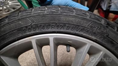 vendo 4 cerchi in lega da 17 comprese di pneumatici misure 205/45 R17 88 più 1 di scorta sempre da 17 senza pneumatico, ricambi originali fiat montavano su una punto del 2008, prezzo trattabile.