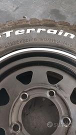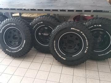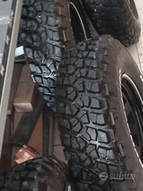 5 gomme Bf Goodrich Mud Terrain, T/A km2, misura 235 85 16, 120 116Q, M+S, DOT 2014, conservate sempre al buio, perfettamente integre, battistrada residuo 13 mm. (quindi quasi nuove) montate su cerchi neri in ferro 16 pollici x 7 di larghezza, leggermente scampanati, usati su un Defender.