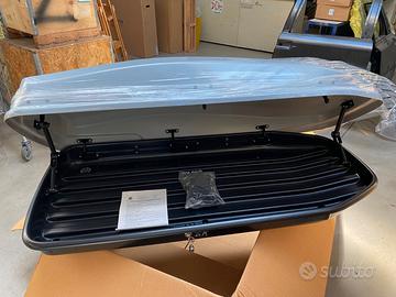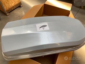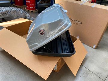 Box contenitore da tetto realizzato in ABS grigio chiaro con sistema di apertura dual side. Chiusura di sicurezza e logo Fiat posteriore.