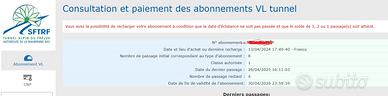 Vendo Abbonamento comprensivo di 4 passaggi (2 viaggi andata e ritorno) per il tunnel Frejus con scadenza 30 aprile 2026. Valore residuo: 140 Vendita: 70 Euro (stesso valore di una corsa andata/ritorno) Passaggi verificabili sul sito ufficiale della società Sftrf come da screen. Valido per Classe 1 (auto) e anche per moto (classe 5) Tragitto: Bardonecchia (Italia) - Modane (Francia) Ideale per la vostra vacanze di Pasqua o per il ponte del 25 aprile in Francia o un'ultima gita di sci a Orelle (Les 3 Vallees). Vi informo inoltre che, come da comunicazione della Società SITAF (gestore del Tunnel) la scadenza di tale abbonamento può esser prolungata di altri 2 anni, presso l'esattore di pista, dal momento in cui rimangono da 1 a 3 passaggi a credito e prima della scadenza del titolo. Quindi si dovrà transitare al Traforo del Frejus entro il 30/04/2026 così da avere un residuo di 3 viaggi e acquistare successivamente una ricarica che proroga di ulteriori 2 anni la scadenza.