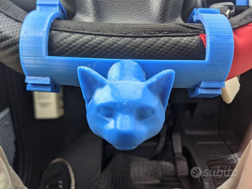 Disegni da rifinire, ma disponibili anche un portacellulare a gravità con braccetti mobili, che si incastra nel foro del cruscotto, lasciando lo spazio per il cavo USB, e che rimane fisso anche nelle curve più spinte e con i telefoni più pesanti, e un pomello a testa di gatto (disegno personalizzabile col giusto incentivo economico) per non dover tenere sempre le braccia alzate sul volante nei rettilinei più lunghi.