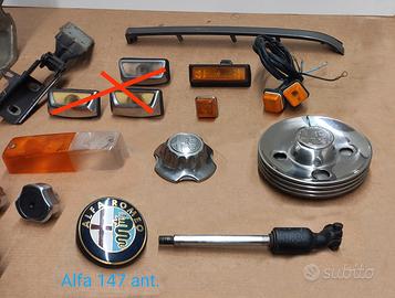 Vendo ricambi vari nuovi e usati come da foto, per : Giulia - plastica freccia anteriore Alfetta - plastiche fanalini posteriori rossi maniglie porte senza chiave. Alfasud - faro anteriore sx, freccia ant.sx 2°serie. Alfasud sprint - coppetta ruota inox. Alfa 75 - staffe paraurti post. Alfa 33 - cerniera cofano ant., mascherina, freccia lat. Alfa 145 - fanale post. lato interno Alfa 147 - stemma ant. diametro 77 con bullone centrale, catadiottro post. Alfa 164 - modanatura sotto faro Alfa 166 - mascherina lato dx Altro : frecce laterali quadrate, coppe ruote Inox , prolunga curva per leva cambio. pomelli interni per deflettori.