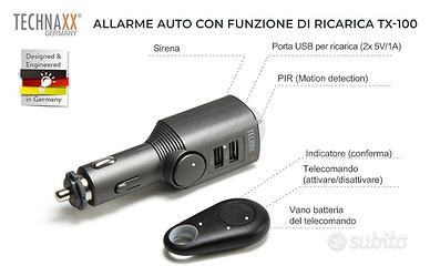 Technaxx Sensore di rilevamento del movimento PIR Sistema di allarme per auto Monitoraggio dell'interno del veicolo Funzione ricarica sirena 110 dB 2 porte USB Allarme portatile con telecomando TX-100