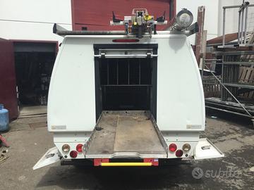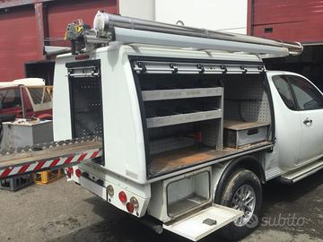 Allestimento officina mobile con portascala, portapacchi e porta tubi sul tetto, dotato di ampie cassettiere e scaffali per attrezzatura e materiali, comode serrande di chiusura. Montato su mitsubishi L200 cabina allungata, ma adattabile a qualsiasi tipo di fuoristrada pik up con caratteristiche simili. Ottime condizioni. Dimensioni: 190 x 170 cm.