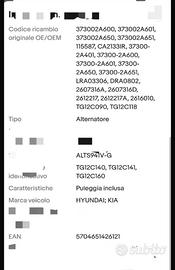 Alternatore nuovo Hyundai ix 20 crd 90 CV 1.4cc compatibile con Kia,vedi foto con codice identificativo,vendo x acquisto errato 110 euro