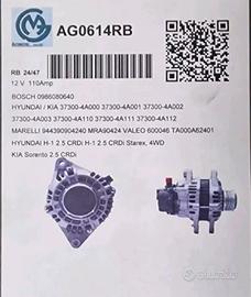 Vendo alternatore nuovo, mai usato, cod. AG0614RB, 12V 110A. Adatto per Hyundai H-1 2.5 CRDi, Starex 4WD e Kia Sorento 2.5 CRDi. Compatibile con codici originali Hyundai/Kia 37300-4A000/001/002/003/110/111/112, Bosch 0986080640, Marelli 1944390904240, Valeo 600046. Alternatore pronto per montaggio, di alta qualità, ideale come ricambio affidabile. Possibile spedizione o ritiro a mano.