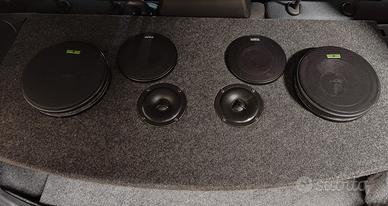 altoparlanti professionali per impianto car audio produzione italiana marca Zacks, più cappelliera per montaggio altoparlanti e vano doppio fondo per alloggiare gli amplificatori in legno con moquette.