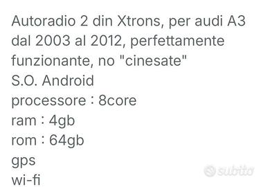 Xtrons 2 din per audi a3 dal 2003 al 2012, no "cinesate", perfettamente funzionate ! Prezzo 250 euro tratt. primo contatto solo whatsapp 3921885358 alessandro