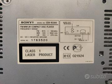 Autoradio CD Sony CDX-R3300 usata ma in ottime condizioni, frontalino estraibile, perfettamente funzionante.Se interessati contattatemi esclusivamente telefonicamente al 3206111900