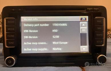 Vendo navigatore autoradio originale Volkswagen RNS 510 C 2011, led, per vw 2007-2015, multimediale :cd/dvd, sd, hd. Navigatore, mappe Europa West aggiornate V17 in 3d, comandi vocali, tmc... Compatibilita: golf 5, 6, passat, tiguan, touran,jetta, scirocco, eos, caddy, new polo, sharan, amarok, maggiolino, california, t5, t6, skoda, seat. Ottime condizioni, perfettamente funzionante, aggiornato 5238 con codice sblocco. No perdi tempo