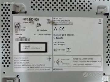 Codice ricambio: 6C0035869 Applicabilità marca: Volkswagen Autoradio originale Volkswagen prodotta da LG, modello MIB Entry. Ricambio originale perfettamente funzionante, ideale per la sostituzione su veicoli del gruppo VW di nuova generazione (piattaforma MQB). Specifiche Tecniche:Produttore: LG s Codice OEM Volkswagen: 6C0035869 Modello: MIB Entry Radio ID Bluetooth: B021199 (Modulo integrato) Versione Software/Serie: WZ4-LGK03.05.1400010951 Funzioni: Radio AM/FM, Media (SD Card/USB), Bluetooth per chiamate e streaming audio. Compatibilità Veicoli:Principalmente installata su: Volkswagen Polo (Serie 6C) prodotta dal 2014 al 2017. Volkswagen Crafter (alcune versioni). Nota: Può essere adattata su altri modelli con slot standard MIB, ma si consiglia il controllo del codice 6C0 035 869. Condizioni del Ricambio:Stato: Usato originale con lievi segni di usura. Estetica: Frontale nero lucido, tasti e manopole perfettamente funzionanti. Nota Tecnica: Come tutti i sistemi MIB, l'autoradio è dotata di Protezione Componenti. Una volta montata su una nuova vettura, potrebbe essere necessario lo sblocco tramite diagnosi ufficiale (Odis) presso un centro assistenza VW o officina specializzata per attivare l'audio e le funzioni. Info Spedizione e Pagamenti:Ritiro: A mano presso la nostra sede di Cellino Attanasio (TE). Spedizione: Rapida in tutta Italia tramite corriere GLS con imballaggio protettivo. Pagamento: Disponibile contrassegno (pagamento alla consegna), bonifico o carte. Autodemolizioni Di Giacinto S.R.L. Frazione Monteverde Basso, snc – 64036 Cellino Attanasio (TE) COD.R48